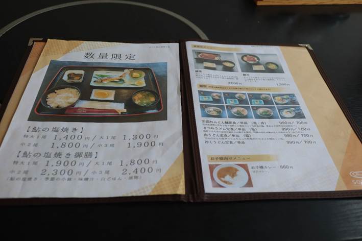 今回は私が「鮎の塩焼き御膳」、妻は「肉うどん定食」を注文。