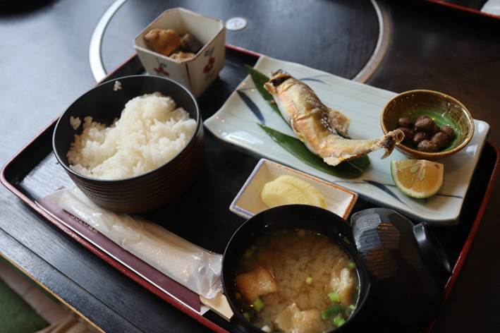 鮎は注文してからじっくり焼き上げるようで、15分ほど待ちましたが、身はふっくら・皮は香ばしく、待った甲斐のある味わい。塩加減も絶妙で、自然の中で食べる鮎の美味しさを改めて感じました。